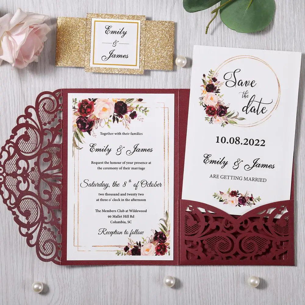 Amazon Com Doris Home 4 7x7 Inch Burgundy Laser Cut Wedding Invitations With Envelopes Kit With Gold Glitter Belly Band Wedding Invitation Cards For Wedding Invite Burgundy 50pcs Blank Kitchen Dining