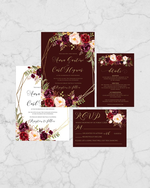 Burgundy Wedding Invitation Printable Invitation Template Etsy
